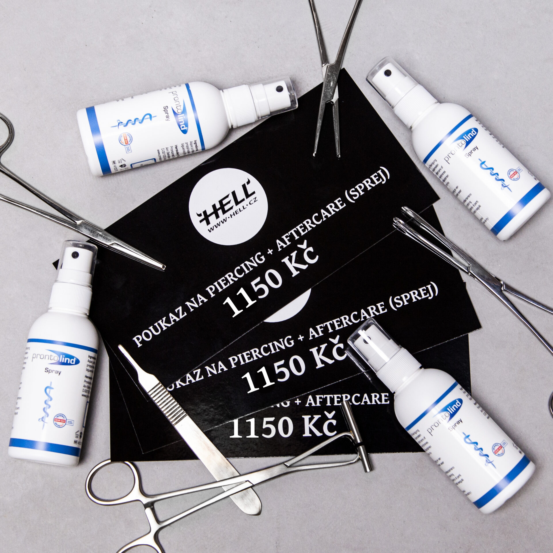 Poukaz na piercing v kombinaci s aftercare sprejem Prontolind nabízíme pouze ve fyzické a nikoli elektronické podobě. Poukaz a sprej si můžete vyzvednout zdarma v Hellu nebo vám ho po přičtení poštovného pošleme. Pokud chcete poukaz na piercing hned a elektronicky, vyberte variantu bez aftercare spreje.